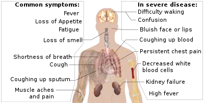 The symptoms of COVID-19 are variable depending on the type of variant contracted, ranging from mild symptoms to a potentially fatal illness.[35][36] Common symptoms include coughing, fever, loss of smell (anosmia) and taste (ageusia), with less common ones including headaches, nasal congestion and runny nose, muscle pain, sore throat, diarrhea, eye irritation,[37] and toes swelling or turning purple,[38] and in moderate to severe cases, breathing difficulties.[39] People with the COVID-19 infection may have different symptoms, and their symptoms may change over time. Three common clusters of symptoms have been identified: one respiratory symptom cluster with cough, sputum, shortness of breath, and fever; a musculoskeletal symptom cluster with muscle and joint pain, headache, and fatigue; and a cluster of digestive symptoms with abdominal pain, vomiting, and diarrhea.[39] In people without prior ear, nose, or throat disorders, loss of taste combined with loss of smell is associated with COVID-19 and is reported in as many as 88% of symptomatic cases.[40][41][42]