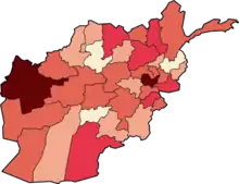 On 7 April, two new cases were reported in Kandahar Province.[64] On 8 April, the 14th death and 20th recovery were announced. A doctor had died at a clinic in Kabul, which was later closed. The first cases were reported in Helmand and Wardak provinces.[65] On 9 April, 40 new cases were reported, as well as the 15th fatality, and 32 recoveries. 14 new cases were recorded in Nimruz, ten in Kabul, seven in Kandahar, four in Paktia, two each in Balkh and Bamyan (the first cases in the province), and a single new case in Logar Province.[66] With 257 cases, four of the 15 Afghan fatalities had been reported in Herat Province. Despite this, no new cases in Herat Province were recorded on 9 April, due to a lack of testing kits.[67][68] The Ministry revealed that the deaths recorded up until 9 April entailed four in Balkh and Herat, three in Kabul, two in Nangarhar, and one each in Daykundi and Takhar provinces.[66]