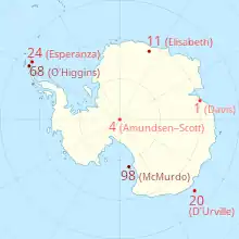 | Davis Station, Estación Mawson, Estación Soyuz, Druzhnaya, Zhongshán, Bharati, Vostok, | 58 | 1 | 0 | [24][25] | ||