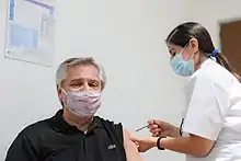 On 21 January, President Fernández became the first Latin American leader to be inoculated against the disease via the recently approved Sputnik V.[90][105] He was later followed by Vice-President Cristina Fernández de Kirchner, who received the vaccine on 24 January.[106]