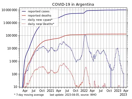 The COVID-19 pandemic in Argentina was a part of the worldwide pandemic of coronavirus disease 2019 (COVID-19) caused by severe acute respiratory syndrome coronavirus 2 (SARS-CoV-2). As of 14 July 2023, a total of 10,044,957 people were confirmed to have been infected, and 130,472 people were known to have died because of the virus.[3]