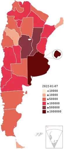 On 7 January, Argentina surpassed over 110,000 positive tests in a single day, marking a record number of cases for a fourth consecutive day due to the surge of Omicron cases.[122]