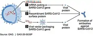 On 31 May 2020, it was announced that Argentine scientists were also working to develop a COVID-19 vaccine, a project subsidised by the Ministry of Science, Technology and Productive Innovation.[141][142] On 10 July 2020, pharmaceutical corporations Pfizer and BioNTech announced that the clinical trial for the COVID-19 vaccine BNT162 that was on phase I–II as of the day of the announcement, would begin on early-August in Argentina, soon after the trial began on Germany and the United States. After it would be approved by the ANMAT, the trial would take place at the Central Militar Hospital.[143][144] The trial is made by mRNA constructs and consists of four vaccines, randomised, placebo-controlled, dose-finding and vaccine candidate-selection, and would begin its phase IIb-III after preliminary data from the previous phase were positive.[145][146][147] One month later, Fernández announced that the vaccine produced by the University of Oxford and AstraZeneca (AZD1222) would begin production alongside Mexico after an agreement with the British pharmaceutical company and the biotechnology company mAbxience. Initially 150 million doses of the vaccine would be produced to supply all of Latin America (with the exception of Brazil).[148][149] As of the day of the announcement, the vaccine, consisting of modified chimp adenovirus vector,[150] was entering phase III.[151]