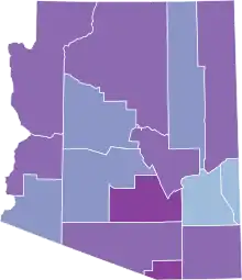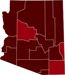 ![]() Map of the outbreak in Arizona by confirmed total infections per 100,000 people (last updated March 2021)