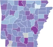 ![]() Map of the outbreak in Arkansas by confirmed total infections per 100,000 people (last updated March 2021)