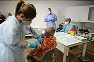 On 13 April, coinciding with the return of non-essential workers, the security forces distributed face masks for public transport users in the main stations of the region.[41] The next day, the Principality of Asturias started mass testing at nursing homes, two weeks after announcing it. On this day, nursing homes accumulated 460 of the 2,059 cases confirmed in the region,[42] being 52 of them, 24 private and 13 subsidized, taken over by the regional government.[43]