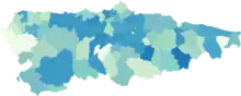 ![]() Confirmed COVID-19 cases per capita in Asturias by municipality as of 6 October: 0 cases per 100,000 people 1536 cases per 100,000 people (Ponga) | |