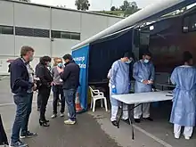 On 31 July, three new outbreaks were declared. One of them was carried out with a well-known bar in Gijón, so the health authorities called people that had attended the pub in the previous two weeks, in order to carry out the relevant tests. Due to the high demand, an auto-COVID station was installed in Gijón.[117][118] The second one was related to a crane company,[119] and the third one affected a nursing home in Siero.[120]