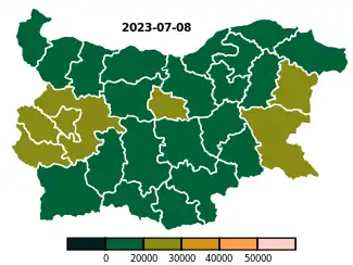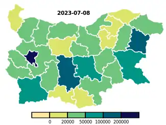 The total number of cases reached 331, an increase of 38 from the previous day. The new cases included 19 in Sofia, 5 in Blagoevgrad, 4 in Burgas, 3 in Varna, 2 each in Kardzhali, Plovdiv and Shumen, and 1 in Smolyan. Four new deaths were also reported, with two occurring in Blagoevgrad and one each in Kyustendil and Sofia.[40] The cases in Blagoevgrad, a mother and her daughter, were initially refused admission to the local hospital despite visible symptoms and had to request testing at a private lab; by the time the results came out as positive, the patients' condition had deteriorated significantly. They were eventually admitted and sent to intensive care, but both died shortly after.[41]