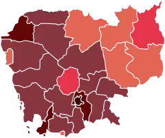 The COVID-19 pandemic in Cambodia was a part of the ongoing worldwide pandemic of coronavirus disease 2019 (COVID-19) caused by severe acute respiratory syndrome coronavirus 2 (SARS-CoV-2). The first imported case in Cambodia was detected in Sihanoukville on 27 January 2020.[3] Although a number of imported cases and transmission to direct contacts were confirmed throughout 2020, no community transmission was detected until 29 November 2020.[4] As of July 2021, Phnom Penh has been the most affected province with the majority of infections and deaths. Banteay Meanchey has the second-highest number of infections, whereas Kandal has second-highest number of deaths.[5]