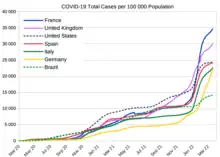 Considering its population, by June 2020 Chile had one of the worst outbreaks in the world.[6] Initially, the number of fatalities reported was lower than in other countries in South America, even those with fewer cases. However, in May 2020, the number of cases and deaths increased rapidly, while several sources reported excess deaths not officially attributed to covid, which were not counted.[7][8] By June 2020, the government confirmed thousands of additional deaths due to COVID-19, including suspected cases where PCR tests were not available.[9] The pandemic reached a peak on 13 June with 195 daily confirmed deaths and nearly 7,000 positive cases.[1] By July 2020, 10,000 people had died, and Chile had the sixth largest number of cases in the world.[10][11] In the following weeks, the number of daily cases and deaths started to decrease slowly, although some local outbreaks appeared. The number of cases increased later in the year, and by March 2021 the number of daily cases exceeded those in the initial wave.[12]