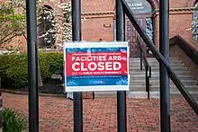 Multiple protests over the state's handling of the pandemic have taken place in Columbus. Protesters from various groups gathered at the Ohio Statehouse for "Open Our Ohio" rallies on April 9, 13, and 18.[14][15] On the 18th, hundreds protested the state "infringing on personal rights", with signs also against vaccinations, abortions, postponing Ohio's primaries, and closing businesses. Cars and trucks circled the Statehouse while honking, and protesters lined High Street for about one and a half hours.[38][39]