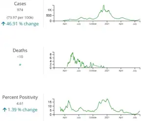 - July 30: The CDC's COVID community transmission map indicates Franklin County has a substantial (orange) incidence of COVID-19 spread.[36]