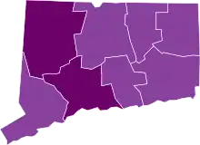 ![]() Map of the outbreak in Connecticut by confirmed total infections per 100,000 people (last updated March 2021)