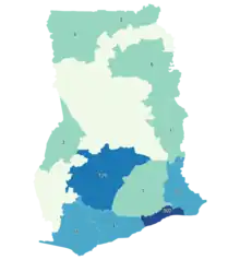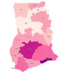 The hotspots identified were in the Greater Accra, Ashanti and Central Regions. In Greater Accra, the Tema Metropolitan, Accra Metropolitan, Klottey Korle and Kpong Katamanso districts recorded the highest tallies with Tema taking the top position, followed by the Ablekuma, Okaikwei South and North, Ashiaman and Adenta areas as well as the Ga Central townships. In the Ashanti Region, Obuasi had the highest figures followed by Kumasi, Oforikrom, and Nkawie. Other areas were Old Tafo, Asokwa, Kumasi Municipal, Kumasi Metropolis and Suame which has high numbers as well. Komenda-Edina-Eguafo-Abbrem (KEEA) District, Cape Coast, and Ajumako are the districts with the high numbers in the Central Region.[30]