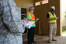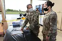 ![]() Guam National Guardsmen dropping a COVID-19 test into a bag for transport to a testing lab, April 22 | |