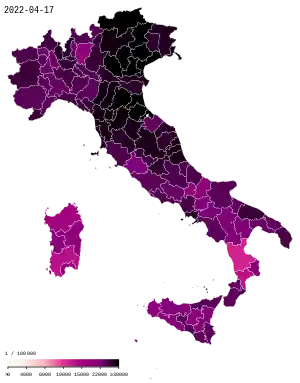 During the peak of the pandemic, Italy's number of active cases was one of the highest in the world.[32] As of 17 March 2023, Italy has 141,988 active cases.[32] Overall, there have been 25,901,529 confirmed cases and 190,906 deaths (a rate of 3,233.641 deaths per million population),[2] while there have been 25,320,467 recoveries or dismissals.[3]
