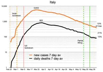 On 31 January, the Italian government suspended all flights to and from China and declared a state of emergency. In February, eleven municipalities in northern Italy were identified as the centres of the two main Italian clusters and placed under quarantine. The majority of positive cases in other regions traced back to these two clusters.[11] On 8 March 2020, Prime Minister Giuseppe Conte expanded the quarantine to all of Lombardy and 14 other northern provinces, and on the following day to all of Italy, placing more than 60 million people in lockdown.[12][13][14] On 11 March 2020, Conte prohibited nearly all commercial activity except for supermarkets and pharmacies.[15][16] On 21 March, the Italian government closed all non-essential businesses and industries, and restricted movement of people.[17] In May, many restrictions were gradually eased,[18] and on 3 June, freedom of movement across regions and other European countries was restored.[19] In October, Italy was hit by the second wave of the pandemic, which brought the government to introduce further restrictions on movement and social life, which were gradually eased in mid-2021.[20]