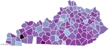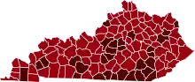 ![]() Map of the outbreak in Kentucky by confirmed total infections per 100,000 people (last updated March 2021)