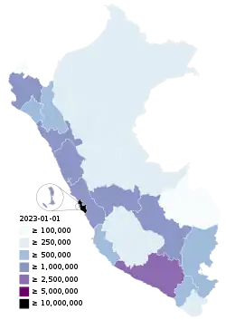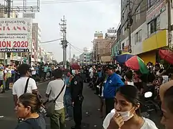Peru's health ministry announced on 13 August that Peru had surpassed 500,000 confirmed cases, noting that 507,996 cases and 25,648 deaths were recorded.[45] On 22 August, at least thirteen people were killed during the Los Olivos stampede in the Los Olivos District of Cono Norte.[46] Quarantine Areas (as of 28 August 2020): Amazonas (Bagua, Chachapoyas, Condorcanqui, and Utcubamba); Ancash (Santa, Casma, and Huarmey); Apurimac (Abancay); Arequipa (Cailloma, Camaná, Castilla, Islay); Ayacucho (Huamanga, Huanta, Lucanas, and Parinacochas); Cajamarca (Cajamarca and Jaen); Cusco (entire region); Huancavelica (Huancavelica, Angaraes, and Tayacaja); Huánuco (Huánuco, Leoncio Prado, Puerto Inca, and Humalíes); Ica (Ica, Pisco, Nasca, and Palpa); Junin (Huancayo, Satipo, and Chanchamayo); La Libertad (Trujillo, Virú, Sánchez Carrión, Pacasmayo, Chepén, and Ascope); Lima (Barranca, Cañete, Huaura, and Huaral); Madre de Dios (Tambopata); Moquegua (entire region); Pasco (Pasco and Oxapampa); Puno (entire region); and Tacna (entire region).[47]