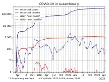 The COVID-19 pandemic in Luxembourg is part of the ongoing worldwide pandemic of coronavirus disease 2019 (COVID-19) caused by severe acute respiratory syndrome coronavirus 2 (SARS-CoV-2). The virus was confirmed to have reached Luxembourg on 29 February 2020. As of 15 March 2023, there are 318604 confirmed cases, with 1223 deaths and 315009 recoveries in Luxembourg.