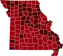 ![]() Map of the outbreak in Missouri by confirmed total infections per 100,000 people (last updated March 2021)