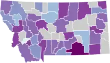 ![]() Map of the outbreak in Montana by confirmed total infections per 100,000 people (last updated March 2021)