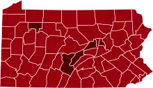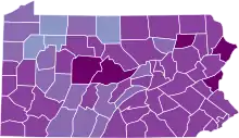 ![]() Map of the outbreak in Pennsylvania by confirmed total infections per 100,000 people (last updated March 2021)