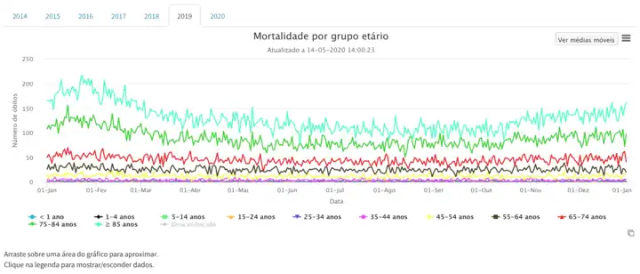 In the following two graphs, the total deaths per day and by age group are presented for the years 2019 and 2020.[73]