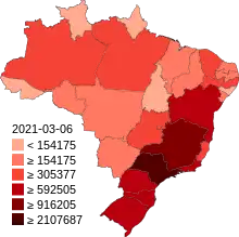 The COVID-19 pandemic in Brazil has resulted in 37,682,660[55] confirmed cases of COVID-19 and 704,159[55] deaths. The virus was confirmed to have spread to Brazil on 25 February 2020,[56] when a man from São Paulo who had traveled to Italy[57] tested positive for the virus. The disease had spread to every federative unit of Brazil by 21 March. On 19 June 2020, the country reported its one millionth case and nearly 49,000 reported deaths.[58][59] One estimate of under-reporting was 22.62% of total reported COVID-19 mortality in 2020.[60][61][62]