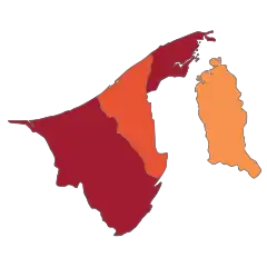 Brunei confirmed its first case on 9 March 2020 in Tutong, involving a 53-year-old man who had returned from Kuala Lumpur, Malaysia on 3 March.[9] It has spread to all districts of Brunei.