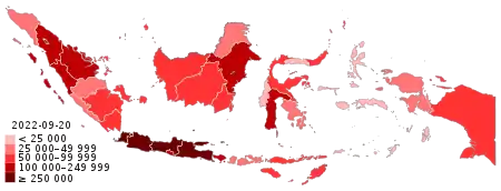 Indonesia reported its first cases on 2 March 2020, after a dance instructor and her mother were tested positive for the virus. Both were in contact with a Japanese national who was later tested positive in Malaysia.[12] By 9 April, it had spread to all 34 provinces in the country. Jakarta, West Java, and Central Java are the worst-hit provinces.