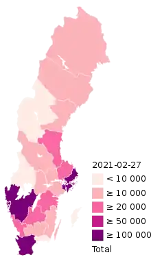 • "Veckorapport om covid-19, vecka 20" (PDF) (in Swedish). Folkhälsomyndigheten. 27 May 2021. p. 12. - "Folkmängd i riket, län och kommuner 31 december 2019 och befolkningsförändringar 1 oktober–31 december 2019. Totalt". Statistiska Centralbyrån. 2019.