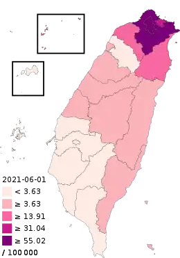 From mid May, Taiwan saw a surge in cases, which had been anticipated by experts due to the combined effect of the emergence of more transmissible variants of the coronavirus, and a low proportion of vaccinated residents (about 1 per cent,[28] or even lower, making it the least vaccinated population in Asia[144]). The low vaccination rate was ascribed to a combination of supply issues with vaccines purchased overseas, and a complacency in the population due to previously low case numbers.[28][144]