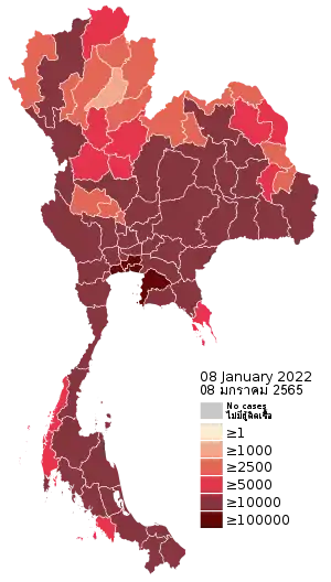 In mid-December, an outbreak occurred in Samut Sakhon, just southwest of Bangkok, increasing the country's total confirmed cases by at least 20%.[45] Cases in the province, which is the center of the country's fishing industry, primarily impacted migrant workers from Myanmar,[45] a major source of labour in the seafood industry.[46] Over 1,300 cases were traced to a seafood market in Samut Sakhon, as cases were detected in 27 provinces.[47] Before the surge, Thailand had recorded about 4,300 COVID-19 cases and just 60 deaths, while Myanmar had registered about 117,000 cases.[46] The 576 cases reported on 20 December was Thailand's biggest daily increase and caused the nation's overall total to climb 13%.[48] A new cluster emerged in Rayong, linked to a gambling den. On 28 December, a worker at the den died, Thailand's first COVID-19 death in nearly two months.[49][50] With the clusters starting to spread into Bangkok, the Bangkok Metropolitan Administration announced that the city would close schools and daycare centres 4–17 January 2021.[51] Soon after, the Ministry of Education ordered all schools closed for the month of January.[52]