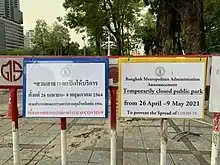 Early April 2021, Bangkok's entertainment venues were ordered to be closed for 2 weeks.[91] Mid-April 2021, schools were ordered to be closed for 2 weeks,[92] taking the 2000+ daily cases into consideration.[93] Since 26 April, more businesses including gyms closed for 2 weeks.[94]