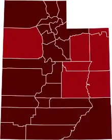 ![]() Map of the outbreak in Utah by confirmed total infections per 100,000 people (last updated March 2021)