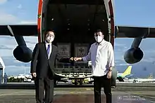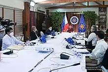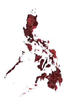 After over a month without recording any cases, the Philippines confirmed its first local transmission on March 7, 2020.[9][10] Since then, the virus has spread to the country's 81 provinces.[11] National and local governments have been imposing community quarantines since March 15, 2020, as a measure to limit the spread of the virus.[12] These include the Luzon-wide enhanced community quarantine (ECQ) that was implemented in March–May 2020.[lower-alpha 3][13] On March 24, President Rodrigo Duterte signed the Bayanihan to Heal as One Act, a law that granted him additional powers to handle the pandemic. This was repealed by a follow-up law, the Bayanihan to Recover as One Act, which he signed on September 11.[14]