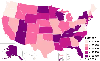 ![]() COVID-19 cases per 100,000 people by state, as of July 11, 2022 | |