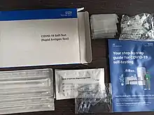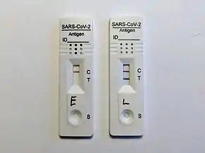 COVID-19 rapid antigen tests or RATs, also frequently called COVID-19 lateral flow tests or LFTs, are rapid antigen tests used to detect SARS-CoV-2 infection (COVID-19). They are quick to implement with minimal training, cost a fraction of other forms of COVID-19 testing, and give users a result within 5–30 minutes. RATs have been used in several countries as part of mass testing or population-wide screening approaches.[1] Many RATs can be used for self-testing, in which an individual "collects their own specimen… and interpret[s] their test result themselves".[2]