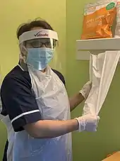 As early as February 2020 frontline healthcare workers began to raise their concern regarding the UK's preparedness to cope with a large-scale outbreak.[11] On 16 March, primary care magazine Pulse reported doctors were receiving out-of-date PPE that had had its 2016 use-by date covered with a sticker saying "2021".[12] In response, the government offered reassurance that this was safe.[13] Earlier in the month, in response to a survey of Pulse's readership, two of five GPs reported they still did not have PPE to protect them from coronavirus.[12] Some of these concerns were raised with Johnson during Prime Minister's Questions, to which the Prime Minister replied the UK had "stockpiles" of PPE.[14] The same day, the Doctors' Association UK (DAUK) reported NHS staff felt they were being put at risk due to lack of PPE.[15]