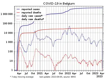 The COVID-19 pandemic in Belgium has resulted in 4,801,887[3] confirmed cases of COVID-19 and 34,376[3] deaths.