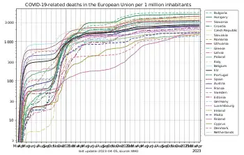 By March 2021, Belgium had the third highest number of COVID-19 deaths per head of population in the world, according to data compiled by Johns Hopkins University. However, Belgium may have been over-reporting the number of cases, with health officials reporting that suspected cases were being reported along with confirmed cases.[10] Unlike some countries that publish figures based primarily on confirmed hospital deaths, the death figures reported by the Belgian authorities included deaths in the community, such as in care homes, confirmed to have been caused by the virus, as well as a much larger number of such deaths suspected to have been caused by the virus, even if the person was not tested.[11]