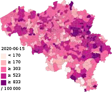 On 26 March, Sciensano published a map that showed that the highest recorded concentrations of infections were found in Alken and Sint-Truiden (Limburg) and Quévy and Honnelles (Hainaut). The hotspot in Alken is thought to have been caused because of two parties that were allowed to gather over the weekend of 7 March.[62] The mayor of Sint-Truiden, who was herself infected by the new coronavirus, mentioned she did not understand the reason for the high incidence in her town.[63] The high level of cases in the affluent municipality of Bonheiden is thought to be linked with the number of travellers who had returned from ski resorts in the North of Italy around the beginning of March.[64] While the high incidence in Honnelles could be linked to an outbreak in a centre for disabled people, the mayor of Quévy had no idea what caused the large outbreak in her municipality but complained of the lack of communication and protective equipment.[65][66]