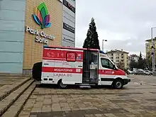 As of 18 February 2021, 5 vaccination sites were available at Pirogov Hospital in the capital, with the medical facility also being in a position to provide 2 additional mobile units.[195] The total number of vaccination points for the whole country had reached 352 by 23 February 2021.[196] The first 24-hour vaccination center in the country began operating in Sofia on 21 February 2021, just outside the University Hospital St. Ivan Rilski,[197] followed by one in Plovdiv on 23 February.[198] Mobile vaccination points were positioned at the entrances of a few national parks in Sofia on 29 and 30 May 2021, allowing all willing Bulgarians to receive vaccines,[199] with the practice continuing in Sofia and other cities in the next month.[200] The Regional Health Inspectorate of Plovdiv established open air vaccination sites in the Stolipinovo district from 12 June 2021.[201][202] Between 8 and 13 June 2021, vaccinations were offered in a number of Varna's shopping malls.[203] A mobile vaccination point inside a bus that is able to accommodate two people at the same time began doing the rounds in Sofia on 16 June 2021.[204] On 19 and 20 June 2021, some of the malls in the capital city hosted mobile vaccination sites,[205] with this practice resuming during the next weekend.[206]
