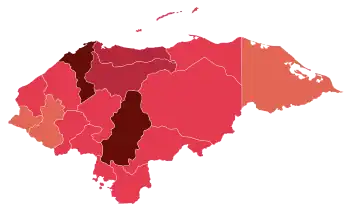 The COVID-19 pandemic in Honduras was a part of the worldwide pandemic of coronavirus disease 2019 (COVID-19) caused by severe acute respiratory syndrome coronavirus 2 (SARS-CoV-2). The virus was first confirmed to have spread to Honduras on 10 March 2020, when two women tested positive for the virus after one of them landed on Toncontín International Airport in a flight from Madrid, Spain, and the other on Ramón Villeda Morales International Airport in a flight from Geneva, Switzerland.[3] Confirmed cases have been reported in all 18 departments of the country, with the majority of cases located in Cortés and Francisco Morazán.