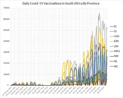 On 17 February 2021, South Africa started its national vaccination program against COVID-19. The program will go through in phases, prioritizing healthcare and frontline workers and then those over the age of 60. According to health officials, South Africa has administered 38,717,957 vaccine doses across the country as of 27 March 2023.[6][7] South Africa has accepted delivery of 3 different vaccines, Janssen (Johnson & Johnson), Pfizer-BioNTech and Oxford-AstraZeneca, administering both Janssen and Pfizer-BioNTech, with the Oxford-AstraZeneca vaccine suspended, after a small study cast doubt on its effectiveness against the Beta variant.[8]