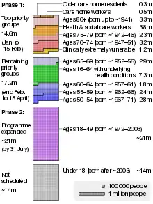 | 8 December 2020 | Residents in a care home for older adults and their carers; and all aged 80 and over | 1 and part of 2 | [44][45] |
