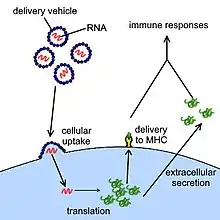 Several COVID‑19 vaccines, such as the Pfizer–BioNTech and Moderna vaccines, use RNA to stimulate an immune response. When introduced into human tissue, the vaccine contains either self-replicating RNA or messenger RNA (mRNA), which both cause cells to express the SARS-CoV-2 spike protein. This teaches the body how to identify and destroy the corresponding pathogen. RNA vaccines often use nucleoside-modified messenger RNA. The delivery of mRNA is achieved by a coformulation of the molecule into lipid nanoparticles which protect the RNA strands and help their absorption into the cells.[50][51][52][53]