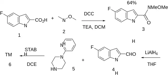 Weinreb ketone synthesis between 5-Fluoroindole-2-Carboxylic acid [399-76-8] (1) and N,O-Dimethylhydroxylamine Fb: [1117-97-1] Hcl: [6638-79-5] (2) gives the Weinreb–Nahm amide, 5-Fluoro-N-Methoxy-N-Methyl-Indole-2-Carboxamide, CID:23003585 (3). This intermediate is further reduced giving 5-Fluoro-Indole-2-Carbaldehyde [220943-23-7] (4). Reductive amination with 1-(2-Pyridyl)Piperazine [34803-66-2] (5) completed the synthesis CP-226,269 (6).